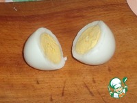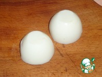 Отварные яйца очищаем и разрезаем пополам поперек. |