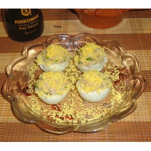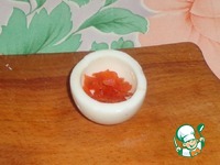Снизу каждую часть надрезаем, чтобы половинка яйца была устойчивой. Обрезки измельчаем и добавляем в паштет, туда же добавляем и желток. Оставляем немного желтка для украшения. |