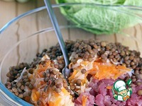 Фарш смешиваем с тушеными овощами и чечевицей, разбираем капусту на листы. |