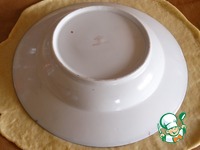 На другом листе бумаги раскатать вторую половину и также вырезать круг с помощью тарелки. Перенести вместе с бумагой и накрыть тесто с начинкой. |