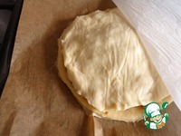 Одну половину раскатать на бумаге для выпечки, вырезать с помощью большой тарелки круг и перенести вместе с бумагой на противень. |