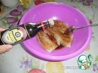 Филе минтая нарезать на крупные куски. Добавить соевый соус и оставить на 10 минут. |