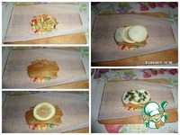 На лист пергамента выкладываем слоями : овощное ассорти, рыбу, лимон, лук, зелень. Сверху добавить 0,5 ст. л. растительного масла. |