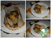 Накрываем вторым листом пергамента. Закрепляем края. выкладываем на противень. Запекаем в духовке 30 минут при 150-170 градусах. |