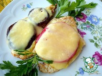 Предварительно замариновать в специях куриную грудку, (от 2 часов). Далее, порезать как на отбивные, отбить через пленку молоточком, кладем на сковороду и быстро обжариваем с 2-х сторон. |