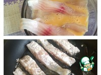 Яйцо взбить, обмакнуть в него полоски рыбки, затем обвалять в крахмале и жарить на растительном масле на достаточно сильном огне с двух сторон. |
