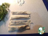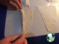 Делим тесто на кусочки по 70 г и раскатываем в тонкий пласт в форме круга, делим круг на 4 части. Мойву предварительно очищаем от головы и внутренностей. Выкладываем рыбу на тесто. |