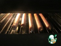 Дальше начинается самый трудоемкий процесс.. Укладываем наши колбаски на решетку, включаем духовку на самый минимум и... на протяжение 3-4 часов (у меня приготовилась за 3ч.20мин)методом включения, выключения духовки (у меня самая обычная духовка) поднимаем температуру духовки до 80-85 градусов при температуре внутри батона 68-70 градусов.