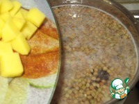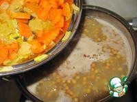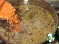 В получившейся бульон засыпать сперва зеленую чечевицу, варить 5 минут |