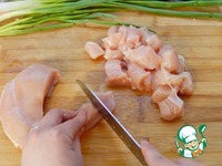 Филе промываем и обсушиваем полотенцем, нарезаем на небольшие кусочки. |