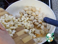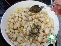 В то время как курица обжаривается нарезаем сельдерей. Отправляем его к поджаренному мясу. Перемешиваем. |