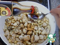 Вливаем соевый соус. Добавляем мелко порубленный чеснок. Перемешиваем. |