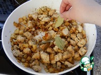 Кладем лавр и вливаем мартини. Убавляем огонь до маленького накрываем крышкой и тушим 10 минут. Включаем духовку на разогрев на 220-250 градусов. |