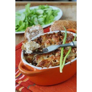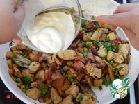 Зеленый лук нарезаем добавляем к мясу. Жар под сковородой выключаем. Добавляем сметану. И натертый на терке сыр Гауда. Перемешиваем. Раскладываем по порционным формам или в одну общую. |