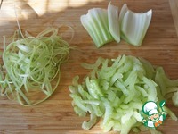 Сельдерей очистить от прожилок и нарезать тонкими ломтиками наискосок, кроме нижних, грубых частей. |