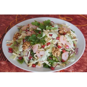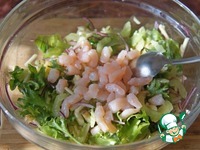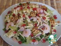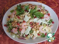 Сверху украсить отложенными креветками, ядрами грецкого ореха, добавить немного заправки. |