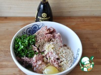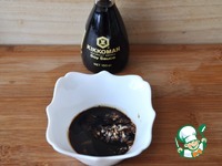 Готовим соус. Берём соевый соус "Киккоман", добавляем сухой корень имбиря, рисовый уксус, кунжутное масло, выдавливаем чеснок, всё перемешиваем. |