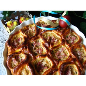 Описание: Дрожжевой пирог из булочек-лодочек с начинкой из обжаренной капусты с зелёным луком, с добавлением сливок, сыра и нежирного бекона. Формовка теста очень лёгкая и быстрая. Готовый пирог легко разбирается на отдельные булочки