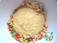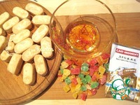 Конфеты и цукаты крупно порубим. Шафран зальём двумя столовыми ложками горячей воды и дадим настояться. |
