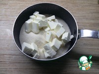 Пока тесто подходит приготовим карамель. Для этого сахар и масло нагреем на плите, пока они не растают. |
