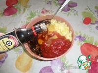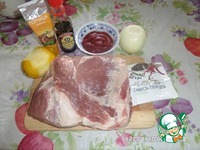 В отдельной чашке готовим наш маринад для мяса. Смешиваем измельченный лук, лимон, томатную пасту, горчицу. Добавляем соевый соус и смесь перцев. |