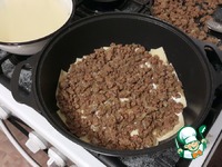 Укладываем на дно формы листы лазаньи, поливаем 1/3 сливок ( у меня 33%) и выкладываем половину фарша. |