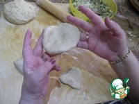 Раскатываем кружочки 1-1,5см. руками выравниваем края и укладываем начинку. 1 ст. л. и лепим пирожки. |