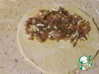 Теперь отщипываем небольшие кусочки теста, раскатываем их толщиной 2-3 мм, блюдцем вырезаем круг. На одну половину теста кладем начинку и разравниваем ее. |
