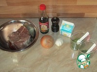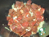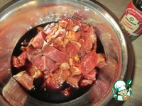 Мясо нарезать крупными кусочками и залить соевым соусом, оставить мариноваться минут 30 |