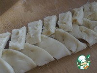 Тесто раскатать в пласт шириной 24 см, разделить вдоль на 2 одинаковые полоски (по 12 см). По краям сделать надрезы наискосок длинной 4 см, а шириной 2 см. В центр положить начинку. |