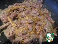 Печень очистить от пленки, нарезать маленькими кусочками (как на бефстроганов) и добавить к обжаренному луку. Жарить все время помешивая, пока печень не обжариться со всех сторон. (7-10 минут) |