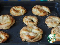 Добавляем муку, масло, вымешиваем. Ставим в теплое место и ждем, пока тесто поднимется. Раскатываем тесто, режем и заплетаем косички |