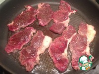 Итак, мясо замариновалось, сковорода горячая, выкладываем наши кусочки и обжариваем с обеих сторон до румяности. У меня по 3-4 минуты с каждой стороны.