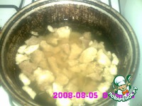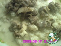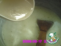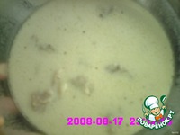 И основа и бульон должны быть горячими. Вливаем тонкой струйкой постоянно мешая и следя за тем что бы основа не свернулась. Варим еще 30 – 40 минут. |