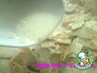 Выкладываем сверху рис и заливаем половиной йогуртно - мясной основой вместе с мясом. Остальную основу выливаем в глубокую тарелку. |