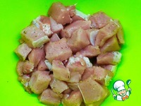 Свинину нарезаем небольшими кусочками, посыпаем специями, тщательно перемешиваем и ставим в холодильник минут на 30. |