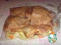В рукав для запекания выкладываем сначала "подушку" из моркови, яблок и лука. А затем порционные кусочки птицы и лавровые листочки. Добавим совсем немного воды, чтоб птица получилась сочной. |