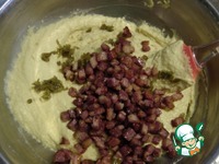 В жидкую смесь вводим сухую и хорошо перемешиваем. Добавляем бекон и перец. И еще раз перемешиваем. |