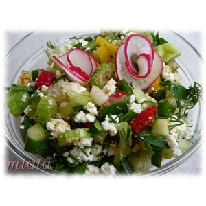 Описание: Наступила весна, пора готовить легкие салаты. Предлагаю овощной салат с добавлением творога и сельдерея. Сельдерей полезен тем, что в нем мало калорий. Стеблевой сельдерей можно добавлять в любой овощной салат, чуть пряный вкус зелени отлично сочетается со всеми овощами.