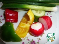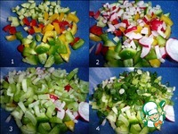 В салатницу выложить слоями половину подготовленных овощей. Добавить 1 ст. л. творога, сверху овощи и опять творог. |