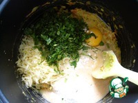 В готовые овощи выложить подготовленную чечевицу, добавить яйцо,1 ст. л. муки, сыр, натёртый на крупной тёрке, измельчённую зелень. Добавить специи и соль по вкусу. Всё хорошо перемешать |