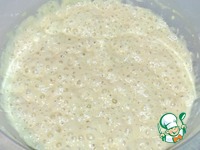 Через 30 минут опара забродила и поднялась. Насыпала в опару муку пшеничную и ржаную. Добавила воду и хорошо перемешала. |