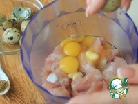 Затем кладем соль, специи, сливки и вбиваем перепелиные яйца. Вместо перепелиных яиц можно взять 2 куриных белка. |