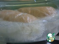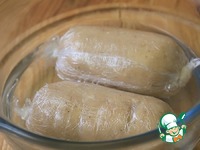 Берем пищевую пленку (мне потребовалось на одну колбаску, примерно 50-60 см) и выкладываем часть фарша. Заворачиваем рулет, туго завязываем края и выкладываем в кастрюлю. Наливаем водой до половины. |