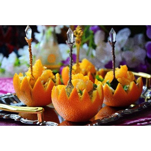 Пока маринуется мясо сделать корзиночки. Апельсин красиво разрезать на две части и аккуратно извлечь мякоть |