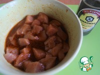 Куриное филе нарезать небольшими кусочками. Выложить в чашу с маринадом, перемешать и оставить на 30-40 минут мариноваться. |