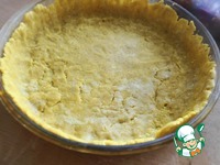Тесто достать из холодильника и раскатать его между двух слоев пищевой пленки. Переложить тесто в форму для выпечки, убрать пищевую пленку, наколоть вилкой в нескольких местах. |