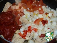 Куриную грудку обжарить на подсолнечном масле в течении 15 минут. Перец чили нарезать мелко. К курице добавить лук, чили, помидор, томатную пасту и немного воды. Тушить 5-7 минут до готовности. |
