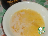 Приготовим заливку. Яйцо разболтать вилкой и смешать с топленым молоком и соевым соусом Kikkoman. |
