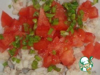 Помидор порезать кубиками. Добавить к основной массе помидор и измельченный зеленый лук. Перемешать, добавить черный молотый перец по вкусу и мускатный орех. |